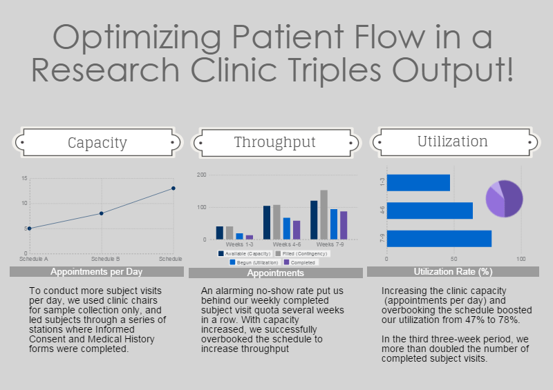 - An important detail specified in the approved study documentation required the study coordinator to leave the clinic frequently to keep study documents in compliance. This negatively impacted telephone coverage and patient flow. Obtaining approval to remove this requirement cut patient discharge time in half, and with improved telephone coverage, our weekly acceptance numbers increased.